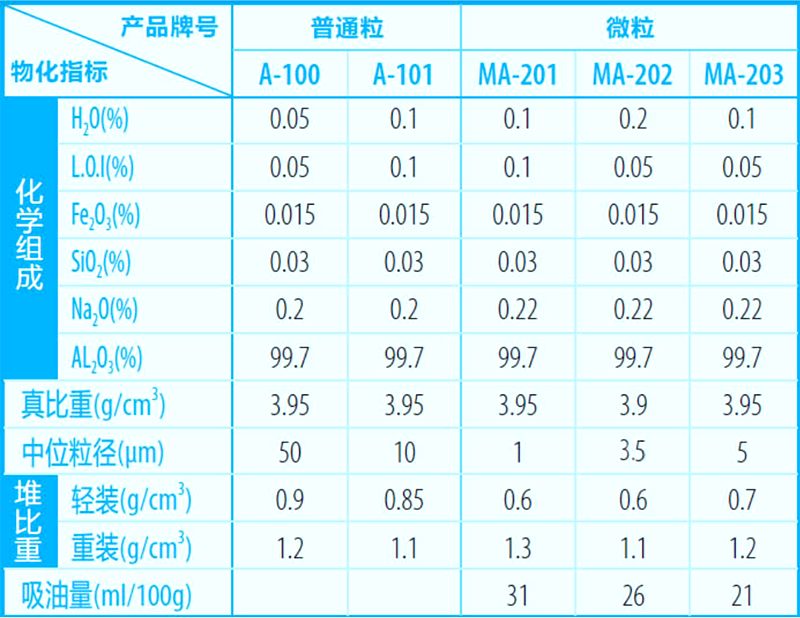 該產品外觀呈白色細沙狀或粉狀,粒度均勻,易于分散,具有良好的燒結性能,本產品是生產耐熱耐腐蝕產品的基本原料,如高鋁耐火材料,陶瓷制品,汽車用的火花塞,電子陶瓷件,鋼鐵爐料,高溫摩擦材料以及拋光研磨制品中的原料。